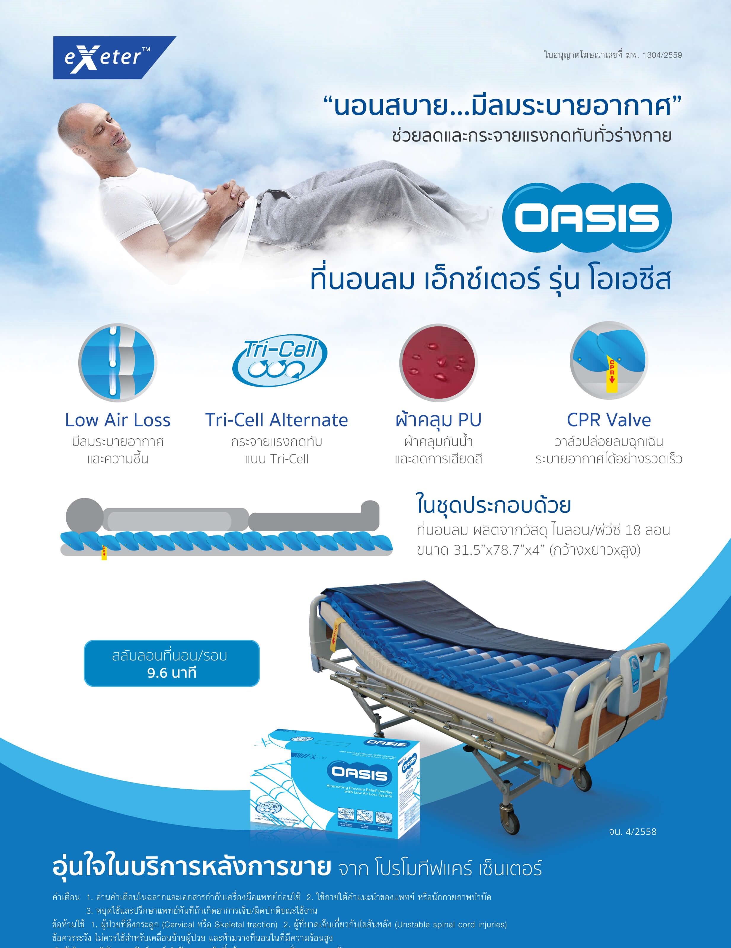 EXETER OASIS ที่นอนลม แถมผ้าปูที่นอน รายละเอียดสินค้า – ช่วยลดอาการบาดเจ็บจากแผลกดทับ ใช้สำหรับผู้ป่วยอัมพฤกษ์ อัมพาต เบาหวาน หรือตามคำแนะนำจากแพทย์ – ผลิตจาก Nylon PVC – ที่นอนลม ขนาด 78.7″(L) x 31.5″(W) x 4″(H) – จำนวน 18 ลอน ชนิด 3 สาย รุ่นใหม่ล่าสุด เพียงรุ่นเดียวเท่านั้น ซึ่งมีประสิทธิภาพดีกว่ารุ่นลอนแบบเดิมๆ อีก 25% – น้ำหนัก 5.6 กิโลกรัม – Tri Cell Alternating มีการสลับการพองตัวของลอนที่นอนอย่างต่อเนื่อง 3 Cell ซึ่งเป็นรูปแบบการกระจายแรงกดทับแบบพิเศษ สามารถลดปัญหาแผลกดทับอย่างมีประสิทธิภาพ – Low Air Loss system มีรูพ่นอากาศขนาดจิ๋วช่วยระบายอากาศและความอับชื้นตลอดเวลา – CPR Valve วาล์วพิเศษช่วยระบายลมอย่างรวดเร็วในกรณีฉุกเฉิน – สินค้านำเข้า จาก ประเทศไต้หวัน ผ่านมาตรฐาน UL,CSA,TUV,CE คำเตือน 1. ใช้ภายใต้คำแนะนำของแพทย์หรือนักกายภาพบำบัด 2. หยุดใช้และปรึกษาแพทย์ทันทีถ้าเกิดอาการเจ็บ/ผิดปกติขณะใช้งาน |