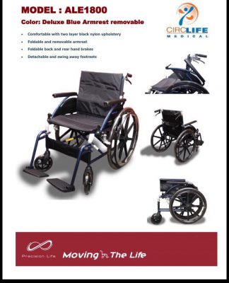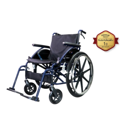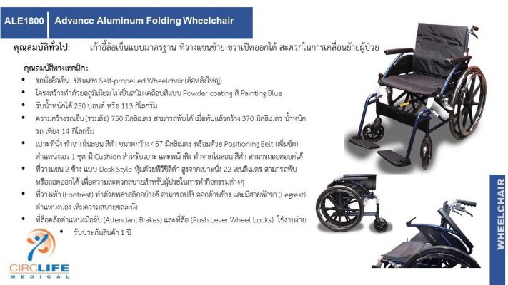 คุณสมบัติทั่วไป : เก้าอี้ล้อเข็นมาตรฐาน ที่วางแขนซ้าย – ขวาเปิดออกได้ สะดวกในการเคลื่อนย้ายผู้ป่วย