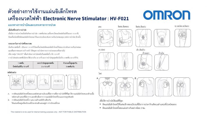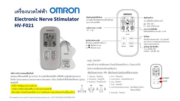 • ใช้งานง่ายด้วยปุ่มกด 3 ปุ่ม เพียงต่อเครื่องเข้ากับแผ่นแปะ เลือกบริเวณที่จะนวด แล้วกดเพิ่มระดับความแรง โดยเครื่องจะนวดครั้งละ 15 นาที